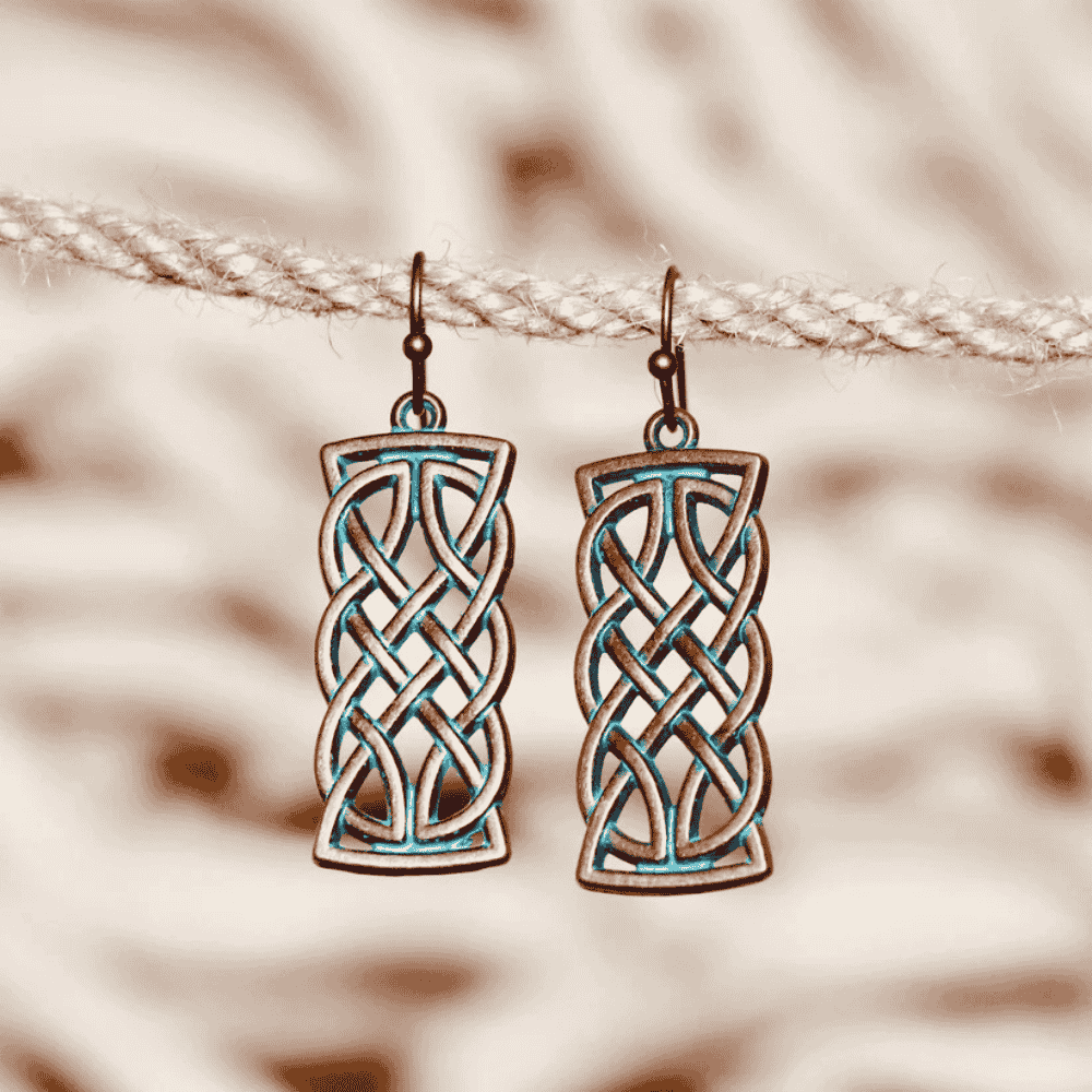 These dangle earrings showcase elongated rectangular pendants adorned with intricate Celtic knot-work in antiqued copper-tone, highlighted by soft turquoise patina inlay. Suspended from slender fish-hook wires, they offer lightweight sophistication and a touch of heritage-inspired charm.